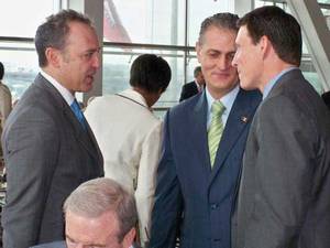 El cónsul de México en Arkansas, Andrés Chao, a la izquierda y el embajador de México en Estados Unidos, Arturo Sarukhan, a la derecha, saludan a algunos invitados en su llegada a la Biblioteca y Centro Presidencial William J. Clinton el martes 31 de Agosto, 2010 en un almuerzo para celebrar el comienzo de la celebración del Bicentenario de la Independencia de México (1810) y el centenario de la Revolución Mexicana (1910). Por: Por Arkansas en Español