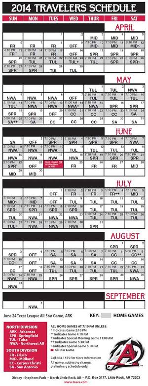 El programa de 140 juegos de los Travelers se divide en dos temporadas de 70 partidos con la primera mitad de temporada concluyendo el 16 de junio. Sesenta y uno de los 70 partidos en casa de los Travelers están programados para jugarse en la la noche a las 7:10 y 6:10 con seis juegos en domingo por la tarde a las 4:10, 2:10 y 6:10, dos juegos en miércoles a las 11:00 de la mañana y un juego a las 2:10 pm el 26 de mayo en Memorial Day contra el actual campeón de la Liga de Texas, San Antonio Missions.